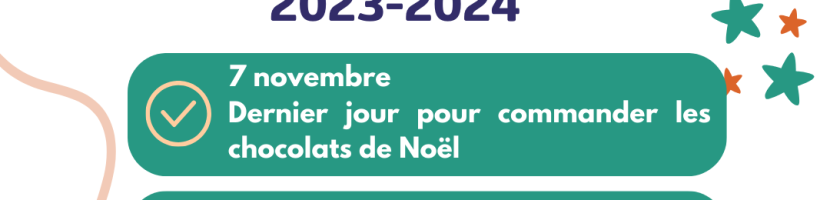 CHERS PARENTS, Nous vous rappelons que le dernier délai pour la commande de chocolat est le mardi 7 novembre. Toute commande qui arrivera après cette date ne pourra malheureusement pas être prise en compte. Les chocolats seront livrés le 15 décembre à la fête de Noël. Merci de votre soutien. (…)